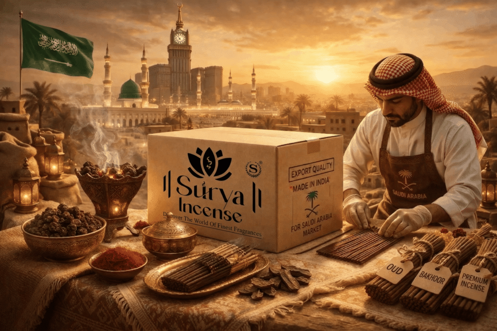 Surya Incense is a trusted incense exporter to Saudi Arabia, offering premium quality incense sticks, bakhoor, and aromatic products tailored for bulk buyers and distributors. As a leading incense exporter to Saudi Arabia from India, incense exporter to Saudi Arabia we specialize in delivering consistent quality, strong fragrances, and export-ready packaging designed specifically for the Saudi market.